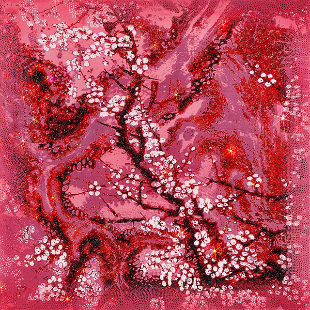 Jongsook takes inspiration from the late Josean dynasty painter Jang Seung-eop, who reinterpreted the Maehwa flower, imbuing it with an accurate realism. By appropriating a common cultural symbol, conventionally depicted in landscape paintings, Jongsook wants to depict a Korean identity that is both traditional, yet modernised. In multi-hued ways, the Maehwa comes alive, dancing and dazzling in front of the viewer.